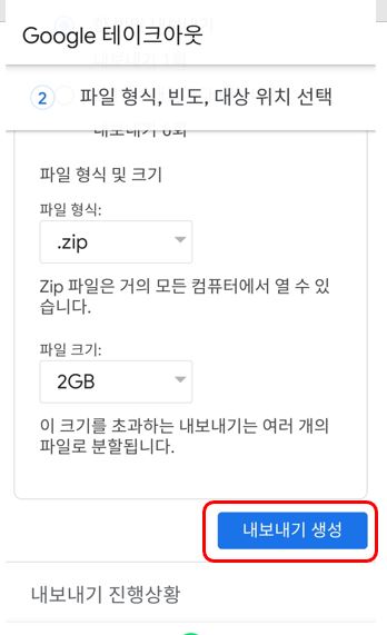 3. 구글 테이크아웃 ▷ 다음 단계 ▷ 내보내기 생성을 눌러주시면 백업이 완료됩니다.