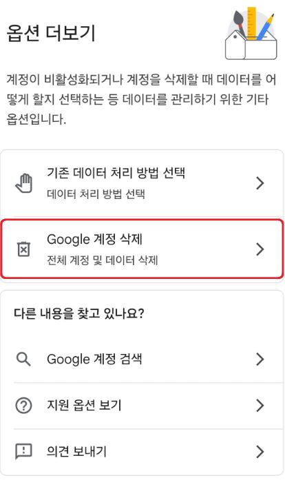 Google 계정 설정으로 이동해 '데이터 및 맞춤 설정'을 누르고 아래로 스크롤해 '계정 또는 서비스 삭제'를 선택해 진행하면 됩니다.